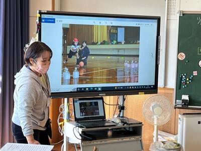 本校の先生たち全員と玉名教育事務所の島指導主事(今回の講師)が見守る中、温められた空気がどうなったのかについて学習しました。