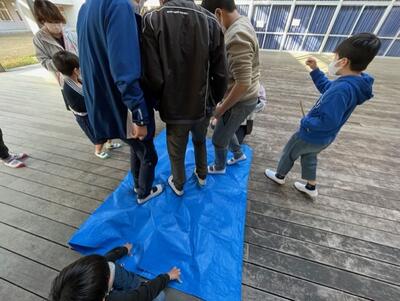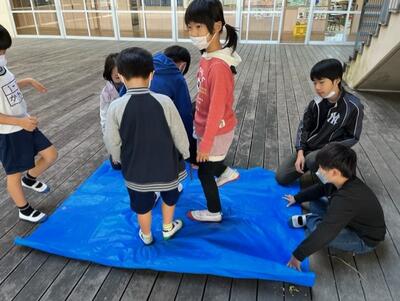 ブルーシートの上に子供たちが数人乗って、足踏みをしていました。