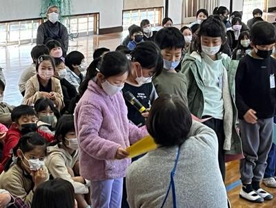 万田小で頑張っていることや児童会リーダーの加来くん、名物先生として初任者の大坪先生のことが記載されています。