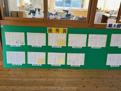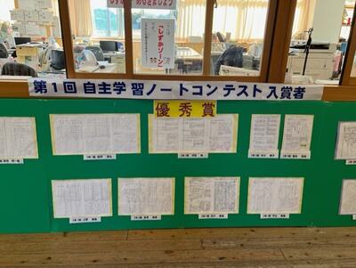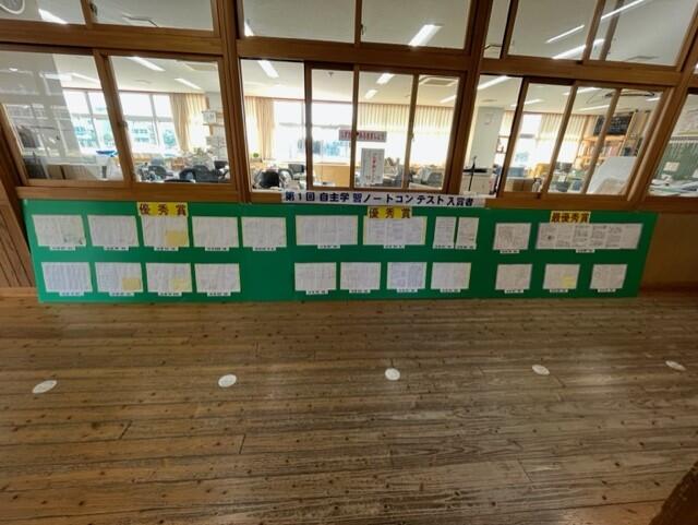 既に受賞者は各教室で賞状が渡されていますが、第1回自学大賞の優秀賞  名、各学年最優秀賞5名のノートのコピーを職員室前に掲示しました。