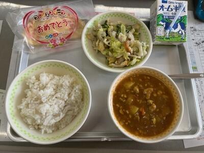 令和4年度最後の給食です。子供たちに大人気のカレーでした。さらに、卒業を祝ってクレープもついていました。
