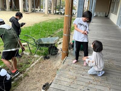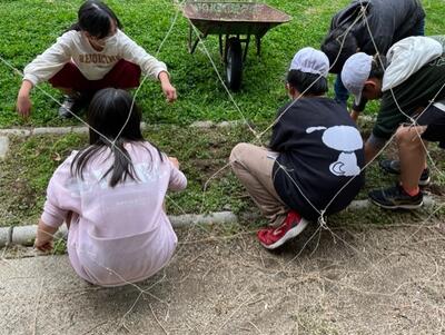 見に行ってみると、花壇周辺の草やグリーンカーテンにからんでいたアサガオの枯れたつるを取っていたところでした。