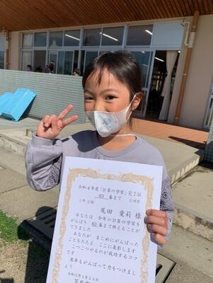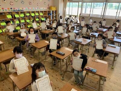 1年生が、この1年間で取り組んできた計算の学習。全部で63番までを全て終わらせた子に完了証を授与しました。