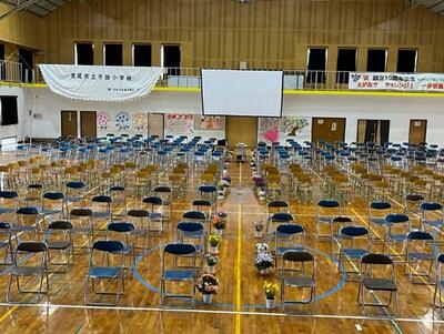 明け方からかなり強く降り続いた雨でしたが、5年生と職員により、朝から最後の準備を進め、ほぼ定刻で卒業証書授与式が挙行されました。