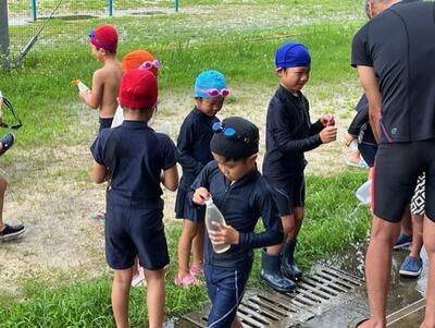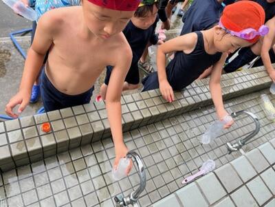 1時間目、教室前の水道のところに1年生が水着姿で集まってきました。