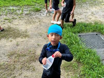 手には、マヨネーズなどの空の容器を持っています。水遊びのようです。満タンに水を入れると、すかさず移動して友達と水の掛け合いをして楽しんでいました。