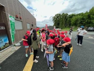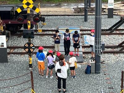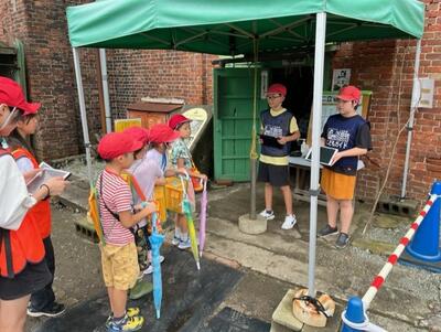 【万田坑ステーション前で案内人の6年生が待っていてくれました】