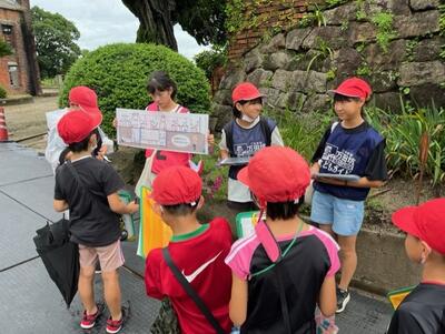11日の6年2組に引き続き、今日は6年1組が、万田坑ガイドデビューしました。ガイドをしたのは、本校の3年1組。