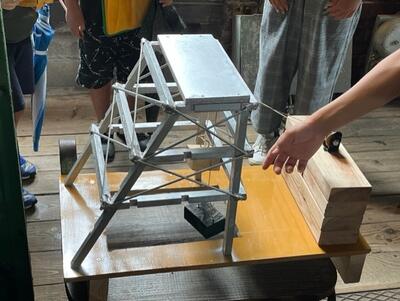 【製作に力を入れた「巻き上げ機と第二立て坑やぐら」の説明にも力が入ります】