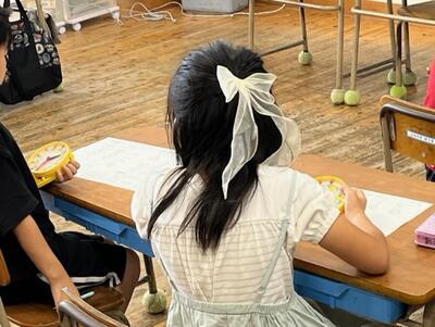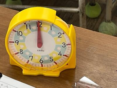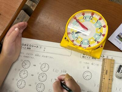 最近はデジタル時計が主流ですが、針のある時計は今でも算数で学習します。生活の中で身につけていくことも多いのでしょうが、子供たちも友達と助け合いながらがんばっていました。