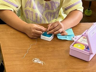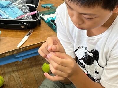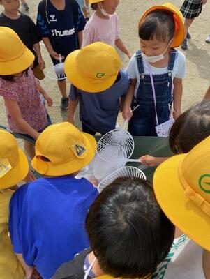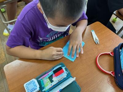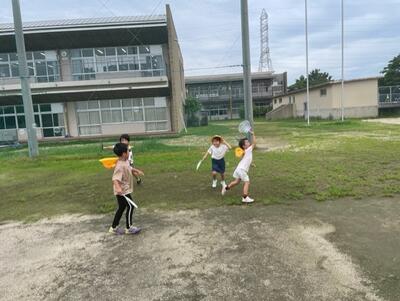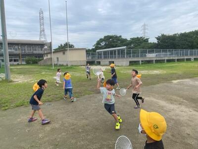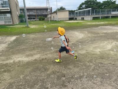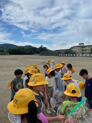 1年生は、うちわの骨を使ってシャボン玉遊びをしました。