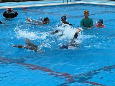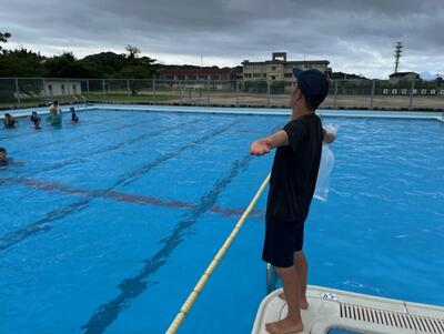 先週から今週にかけて、どの学年でも夏休み前に着衣泳(服を着た状態で水に入る)に取り組んでいます。