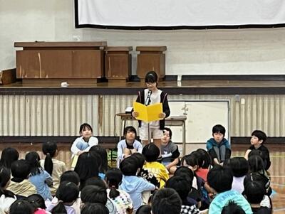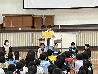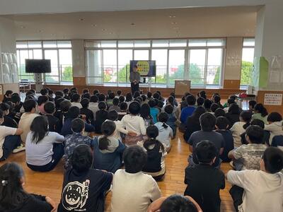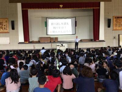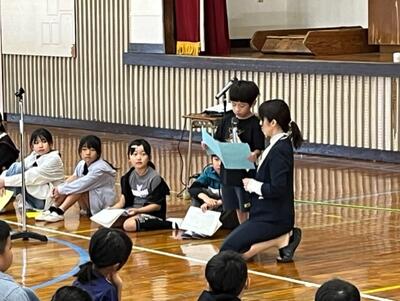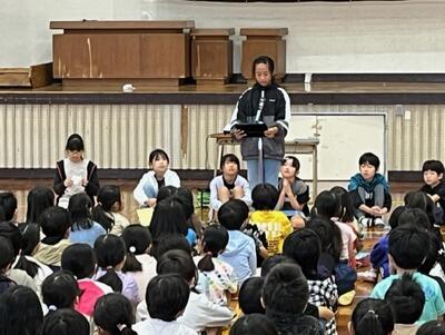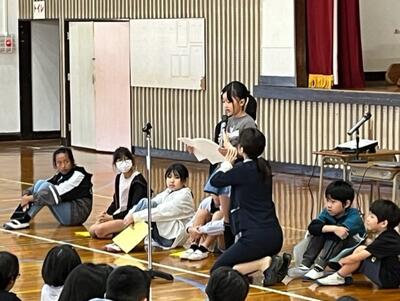 1時間目には体育館に全校児童が整列し、代表児童の発表や校長先生の話がありました。