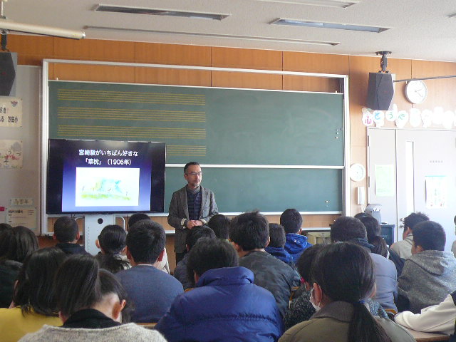 熊本大学の先生による講義を6年生が受ける! 投稿日時 : 2018/02/08 承認者 6年生向けの本物体験シリーズ、第5弾くらいになるでしょうか。今日は、熊本大学教育学部の跡上(あとがみ)先生においでいただき、「授業」でなく「講義」をしていただきました。タイトルは「ジブリアニメに影響を与えた夏目漱石『草枕』」でした。大学の講義は、もちろんみんな初体験。でもみんな大学生気分を味わえたのでは。本来は90分ですが、今回は約65分でした。夏目漱石がいなかったら、ジブリアニメは生まれていなかったかも・・・。そんな感じがしましたね。P1130835 (640x480).jpg