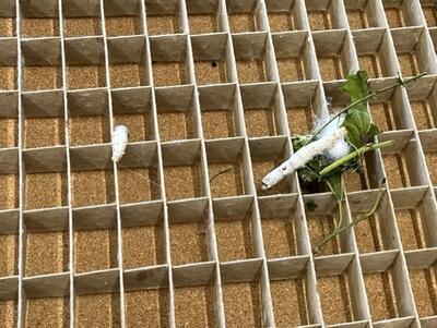 これから、写真のような仕切りのある部屋に入って、次々にまゆを作るのでしょうが、よ~く見ると細~い糸を口から吐き出しているのがわかりますね。