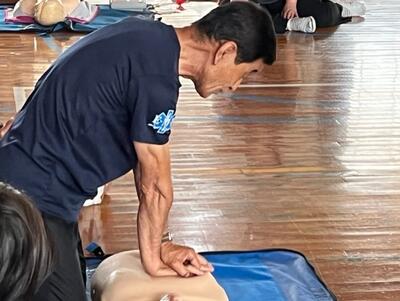 いざというときに、救急車を要請して到着するまでの平均到着時間は9分だそうです。その9分間の間にできる心臓マッサージやAEDの操作方法を教えていただきました。