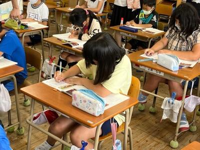 2時間目に出発し、国道沿いを通って有明プラザまで行ってきました。蒸し暑かったけど、みんな元気に校区の様子をメモしていました。