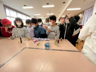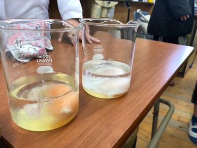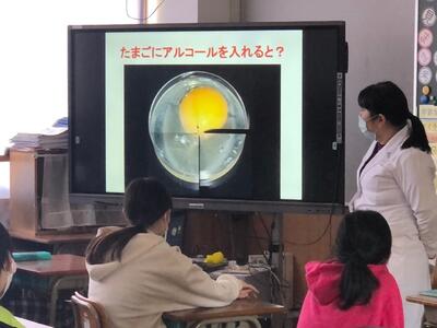 生卵にアルコールを入れるとどのように変化するのかという実験を子供たちの目の前でされたのですが、子供たちは真剣な表情でそれを見ていました。