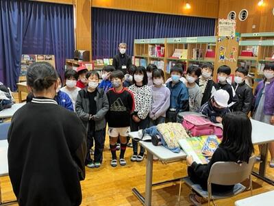 給食の時間にくじらぐものお二人が来校されて、読み聞かせをしていただきました。