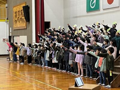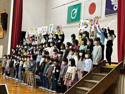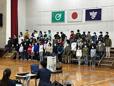 ★総合的な学習の時間で学んだ「荒尾市の魅力(有明のり、小代焼、万田坑、海達公子)」について、替え歌で伝えてくれました。特に、市民文化祭で披露した、海達公子さんの「学校」の群読はさすがでした。