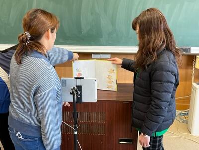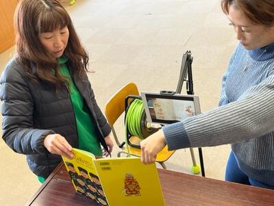 写真のように、タブレットの前で絵本を開いての読み聞かせとなりました。お忙しい中ありがとうございました。