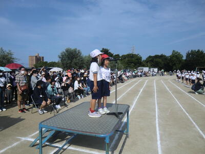 1年生代表の元気な「はじめの言葉」団長2人の「誓いの言葉」「準備運動」で元気に開会しました。