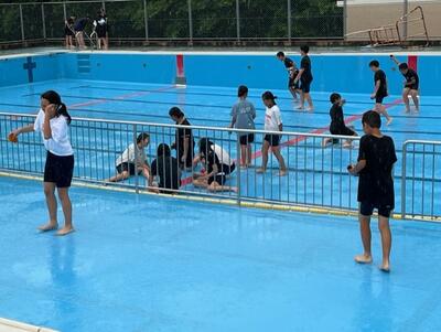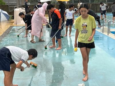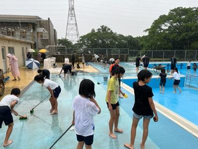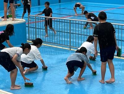 昨年の8月以降使われていなかったプール及びプールサイドの汚れを取り除き、きれいに仕上げてくれたのが、5,6年生の子供たちでした。