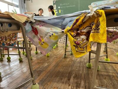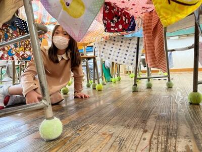 3年生の授業で「布をつないで秘密基地を作ろう」というものです。