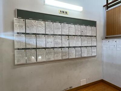 先日紹介した6年生に続き、5年生も算数レポートが掲示されました。掲示してあるのは、北校舎東側階段です。