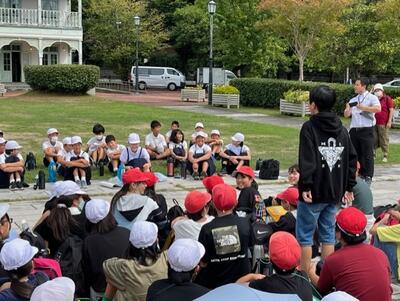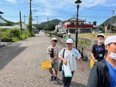 現地にはスタンバイしていた三角小6年生の歓迎を受け、早速スタンプラリーの開始!