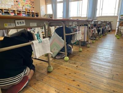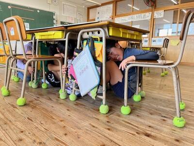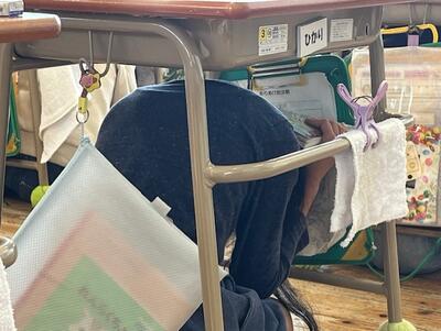 子供たちは、一斉に机の下に頭を隠します。