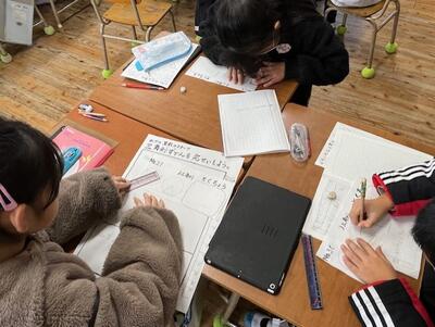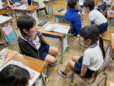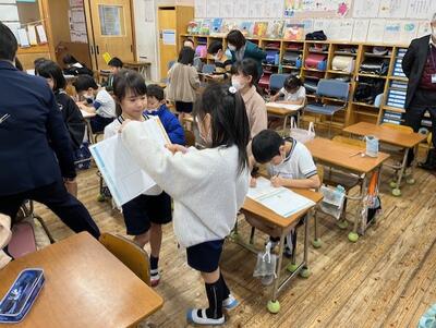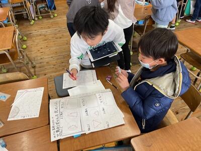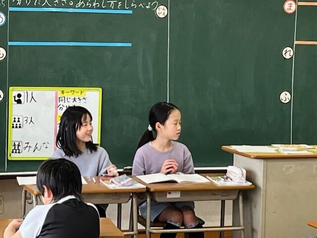 自分が書いた考えを、友達と交流しながら確認していました。活気のある授業です!