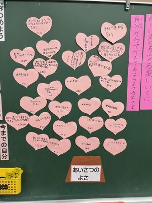 「あいさつのよさの木」になるように、一人一人がハートの形の紙に、あいさつの良さを書きこんで貼っていきました。
