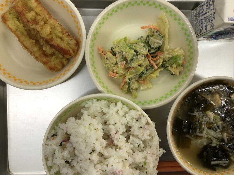 菜飯、牛乳、い草そうめん汁、ちくわ磯部天ぷら、ごまマヨネーズサラダ