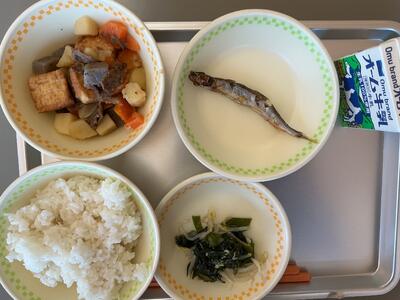 麦ごはん、牛乳、厚揚げのそぼろ煮、焼きししゃも、おかかあえ