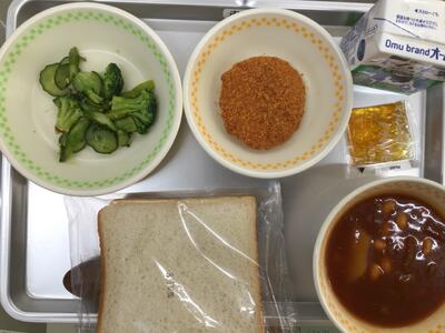 食パン、牛乳、ポークビーンズ、鮭キャベツカツ、グリーンサラダ、ミカンジャム