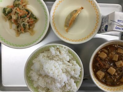 麦ごはん、牛乳、麻婆豆腐、肥後ぎょうざ、バンバンジーサラダ