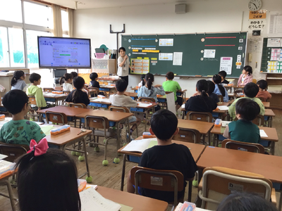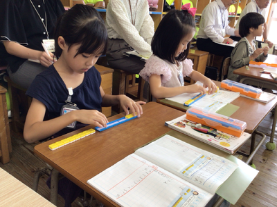 1年2組で算数科「たしざん」の研究授業がありました。早く正確に計算するために、どんな計算方法があるのか話し合っていきました。