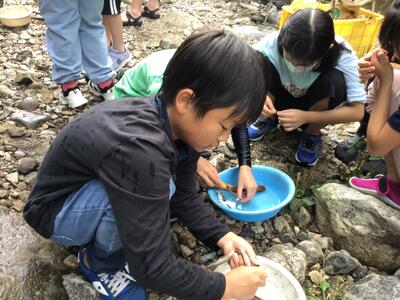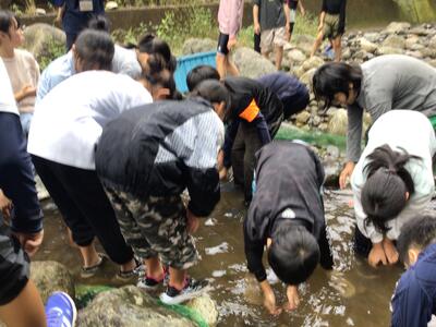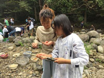 ニジマスつかみでは、施設の方からニジマスのさばき方を教えていただきました。まず、ニジマスを叩いて気絶させ、そのあとナイフを入れて内臓を取り出します。その様子に驚く子供たちもいましたが、「命をいただくことのありがたさ」を感じたようです。