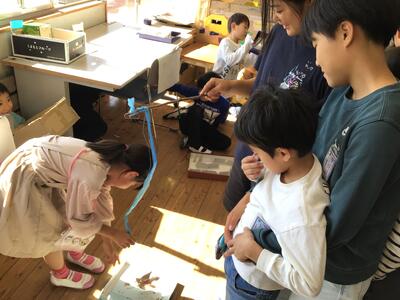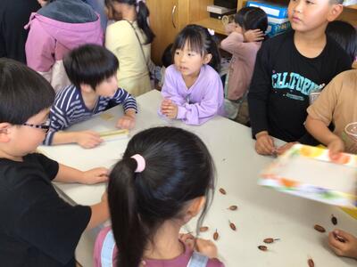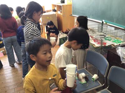 1年生が生活科の時間に作った「秋のおもちゃ」で、昼休みに上級生を招待して「秋のおもちゃランド」を開きました。
