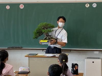 日本人とは言え、最近ではなじみの少ない「盆栽」ですが、教科書の写真だけでなく実物を子供たちに見せたことで、子供たちの興味・関心も高まりました。