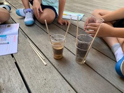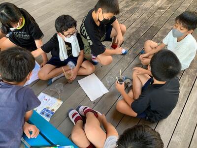 図書室横のテラスに4年生が集まっていました。何をしているのかよ~く観てみると、理科の授業のようです。