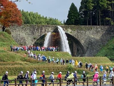 予告どおり通潤橋の放水が始まりました。本来は、通潤橋内の水が通る管の中をそうじする為なのですが、やはり放水を間近で見ると歓声が上がります。