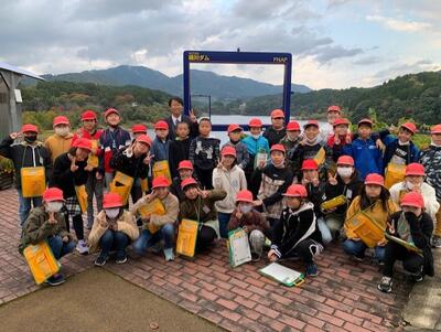 【最後はクラス別に緑川ダムの湖を背景に記念写真】