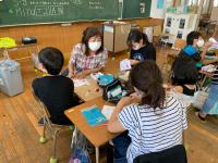 5年生は、現在教室とPTA会議室(1組)、教室と理科室(2組)に分かれてハイブリッド授業が行われています。