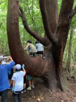 途中かなり急な坂を登り切ると、こんな不思議な形をした天狗杉に到着。みんなで記念撮影をしました。