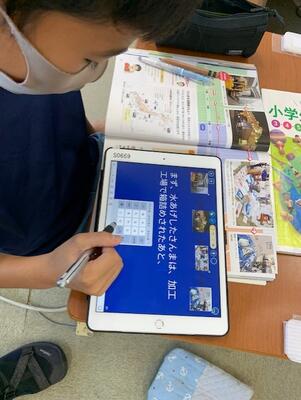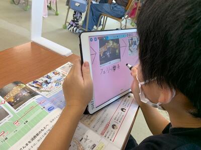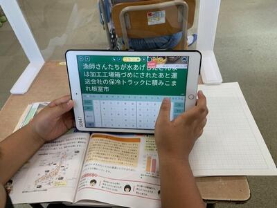 社会の授業は、課題に対して教科書の中からその理由を考え、根拠となる資料をタブレットで撮影して自分の意見をまとめる作業を行っています。