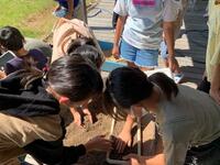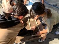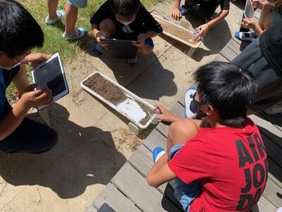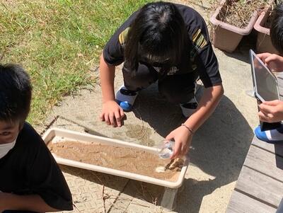4時間目に北校舎1階のテラスでは、5年生が集まって何やら実験をしていました。