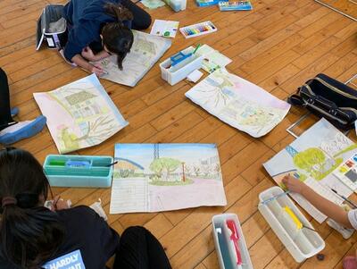 いくつかのグループに分かれて、校内の絵を水彩絵の具で仕上げているところでした。