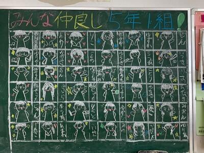 5年1組の後ろの黒板には、クラス全員のイラストが描かれていました。遊び心ありますよね!
